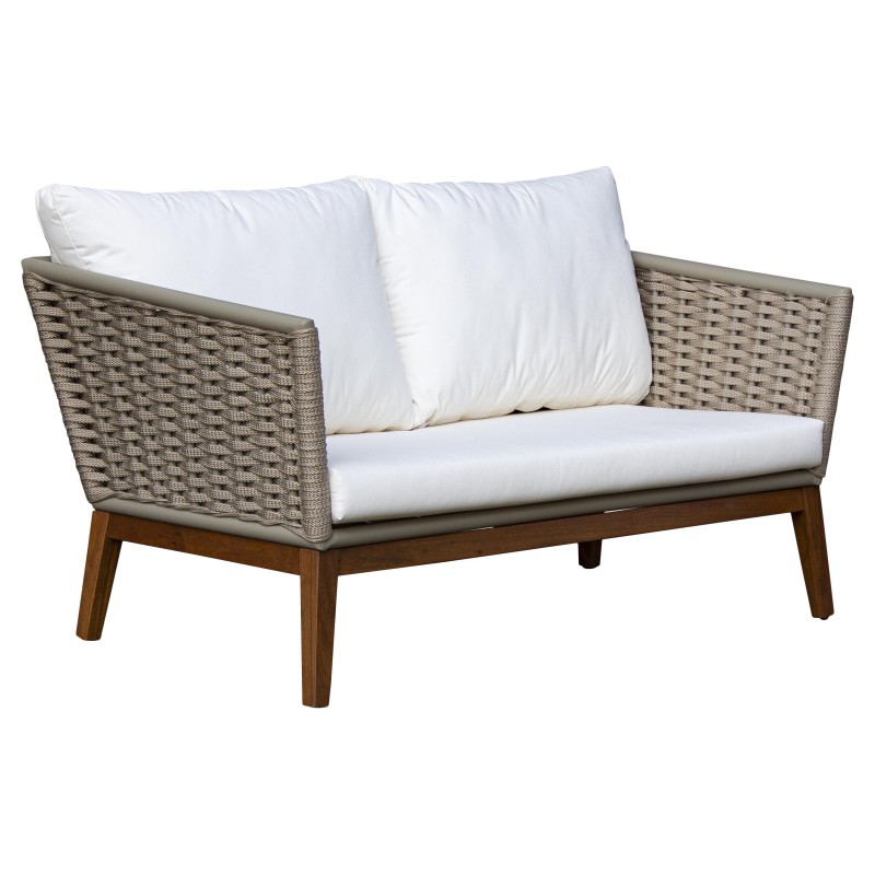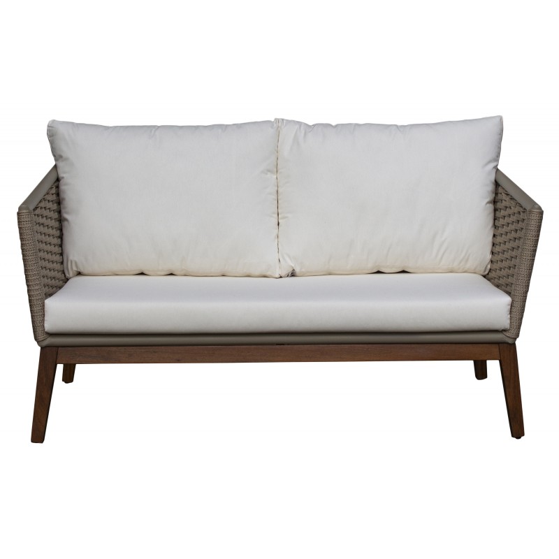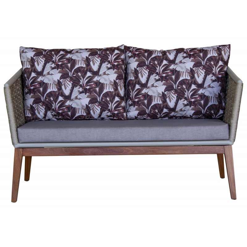 Sofá 2 lugares em corda, madeira e alumínio. Produto para uso em área externa.