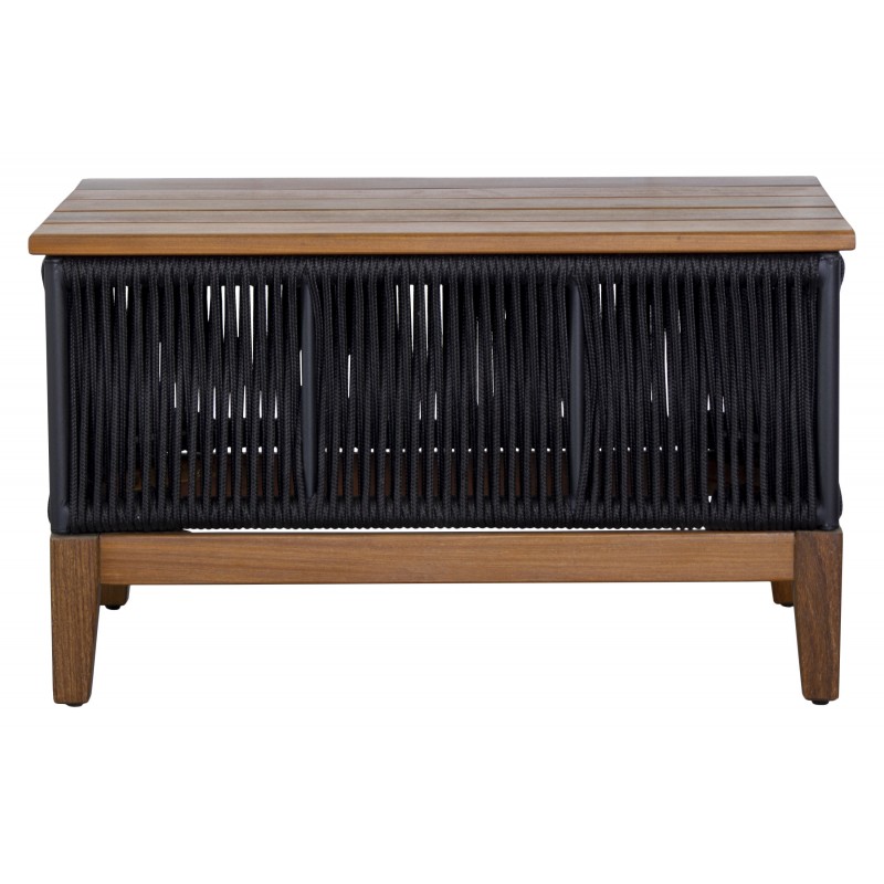 Mesa centro em corda e alumínio com tampo e pés em madeira. Produto para uso em área externa.