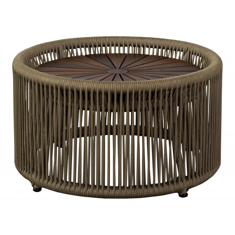 Mesa centro em corda e alumínio com tampo madeira. Produto para uso em área externa.