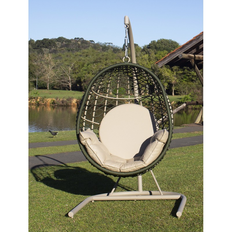 Poltrona em corda e alumínio. Produto para uso em área externa. Pode acompanhar suporte em aço carbono.