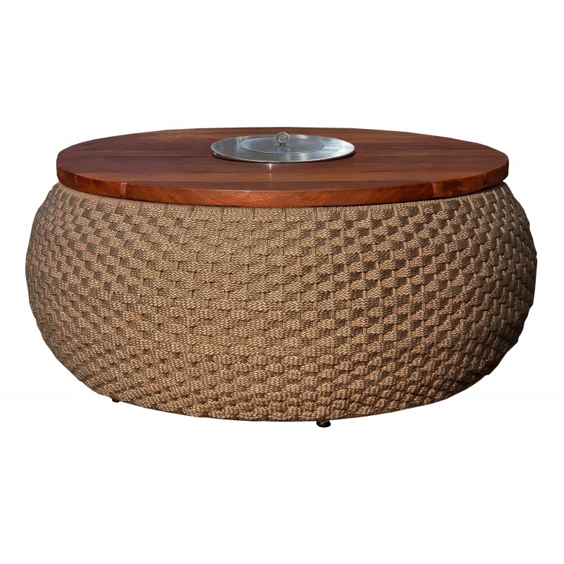 Mesa centro em corda e alumínio com tampo madeira e lareira a álcool. Produto para uso em área externa.